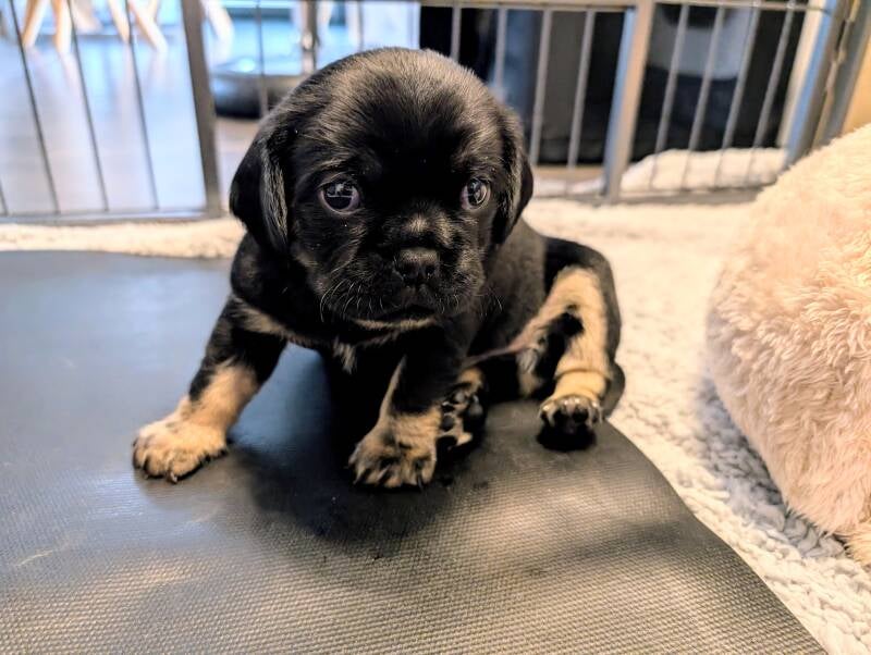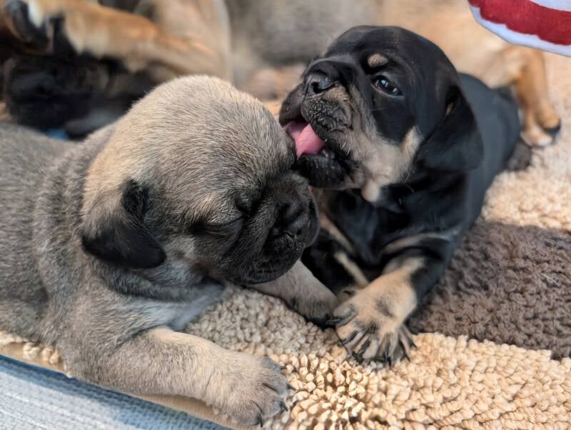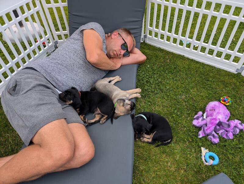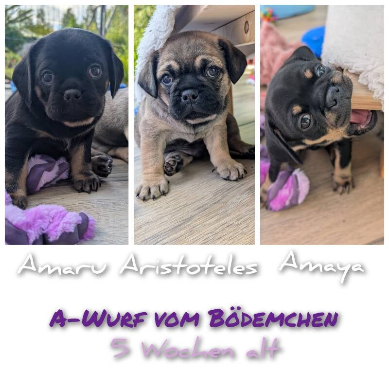 Die Kleinen toben und spielen jetzt mit uns und die Wachphasen werden deutlich länger. Sie machen Pipi fast ausschließlich auf die Pipimatten oder Gras. Jetzt fangen wir auch an, ihnen bei zu bringen, was sie dürfen und was nicht. Zehen ankauen ist zwar immer noch niedlich hihi, aber jetzt lernen sie, dass man nicht die Menschen anknabbert sondern dafür das Spielzeug gedacht ist 😁