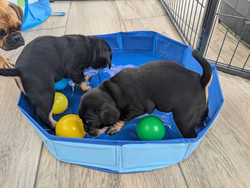 Damit wir uns gut entwickeln und ganz unerschrockene Hunde werden, dürfen wir ganz viele Dinge kennenlernen. Bällebad, Pool, Drehplatte, Klettermöglichkeiten, Krach machendes Babyspielzeug,... Wir durften auch schon mit dem Staubsaugerroboter spielen, das macht uns alles gar nix!