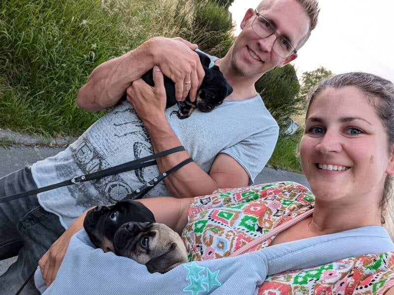 Wir gehen jetzt jeden Tag spazieren: an der Leine, ohne Leine, im Hundewagen. Vor allem das selber laufen lieben sie sehr.